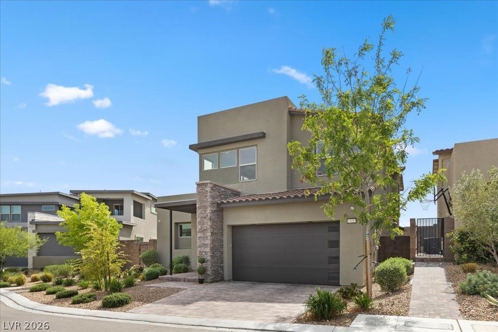 Gated Summerlin West Modern Home on Pool-sized lot, blends contemporary design w/everyday functionality. Features 4beds, 3.5ba, loft & Glass-front office. Downstairs Ensuite provides privacy for guests or multi-gen living. Chef's kitchen has XL waterfall island, high-end appliances & seamless flow for entertaining or relaxed living. Modern elements include a statement staircase. Primary suite with a spa-inspired shower-room, access to laundryroom & private balcony w/city lights, Red Rock Resort & Casino Fireworks & surrounding mountain views. Backyard size offers ability to design a resort-style oasis. 2 renderings available. Located 5-7 mins to Downtown Summerlin (dining, shopping, entertainment) Trader Joes, Costco, Lifetime Fitness, Red Rock Canyon (hiking, biking), Steps away from the 92acre GrandPark (pickleball, basketball, baseball, bbqs) Top-rated Schools, this home delivers modern luxury, functional design & strategic positioning in one of the most sought-after Communities.