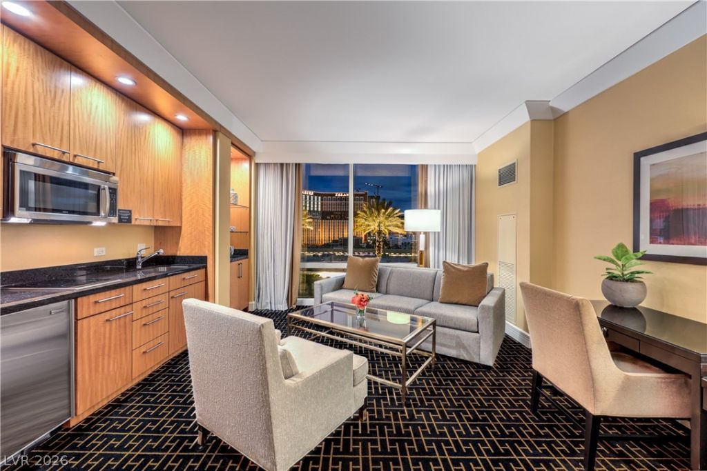 Perched on the 16th floor, this refined studio residence offers expansive views of the world-famous Las Vegas Strip. Thoughtfully crafted for both comfort and elegance, the interior blends contemporary sophistication with everyday functionality. Highlights include detailed crown molding, a plush king-size bed, custom built-in features, and a stylish kitchenette designed for ease and efficiency. The luxurious bathroom features a dual-sink vanity and a spacious six-foot soaking tub, providing a peaceful escape. This exceptional residence embodies the spirit of high-end, resort-style living with timeless allure.
