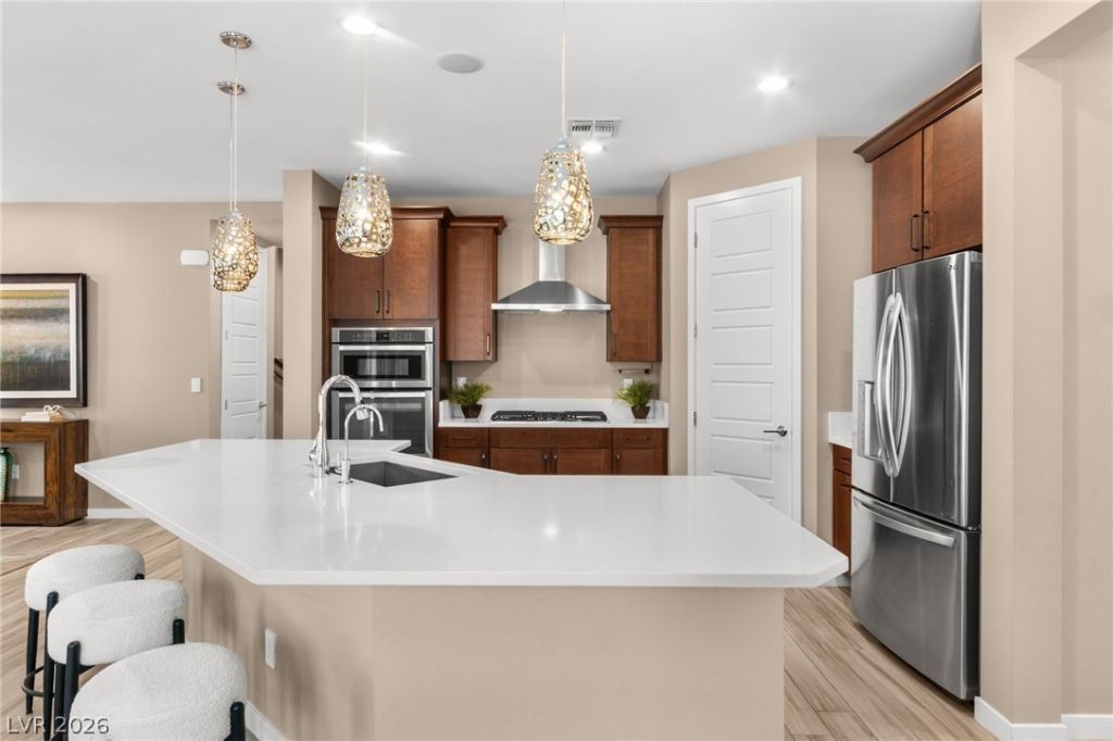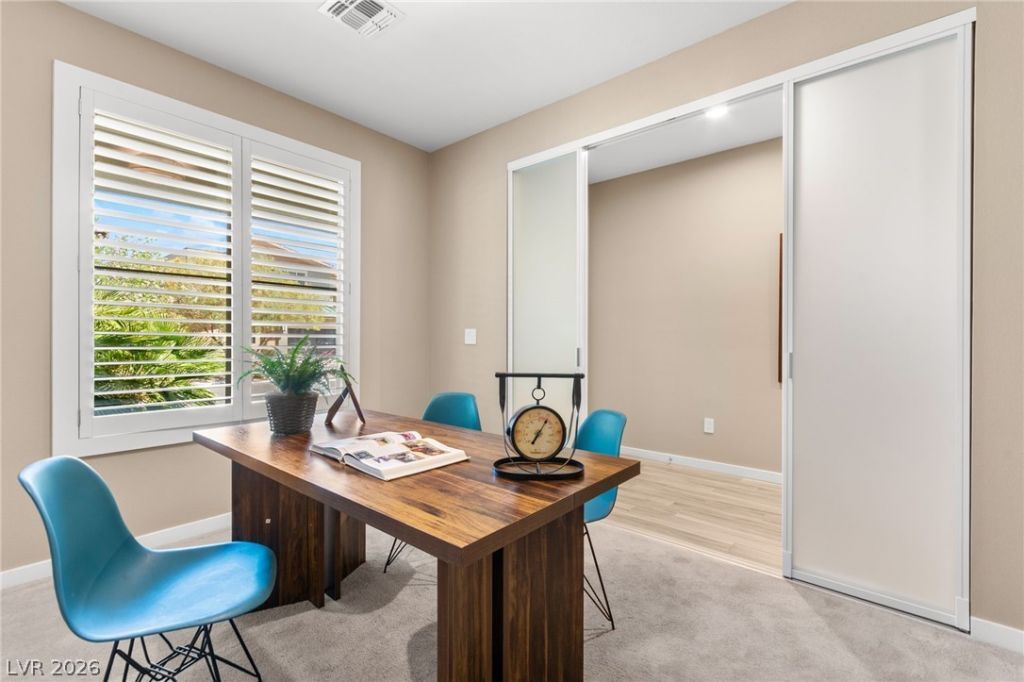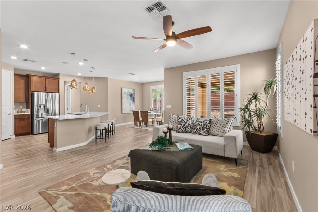 Tucked behind the gates of Vistara in The Cliffs of Summerlin, this exceptional home blends privacy, technology, and elevated living just moments from Bishop Gorman High School. Thoughtful layout features a stunning kitchen with rich walnut cabinetry, oversized island, and seamless flow into the great room and dining nook, perfect for everyday living and entertaining. Expansive picture windows with shutters fill the space with natural light and frame the, private backyard with beautiful mountain views. With 5 bedrooms and 3 full baths, including a bedroom and full bath down ideal for long-term guests or multigen living, this home offers both flexibility and comfort. Upgrades include whole-home ethernet wiring, surround sound, and a smart cabinet system in the laundry room for modern convenience. Finished 2-car garage with epoxy floors and EV charging. This gated community is known for its tranquility and prestige, a rare balance of seclusion and connection. Check out the Virtual Tour